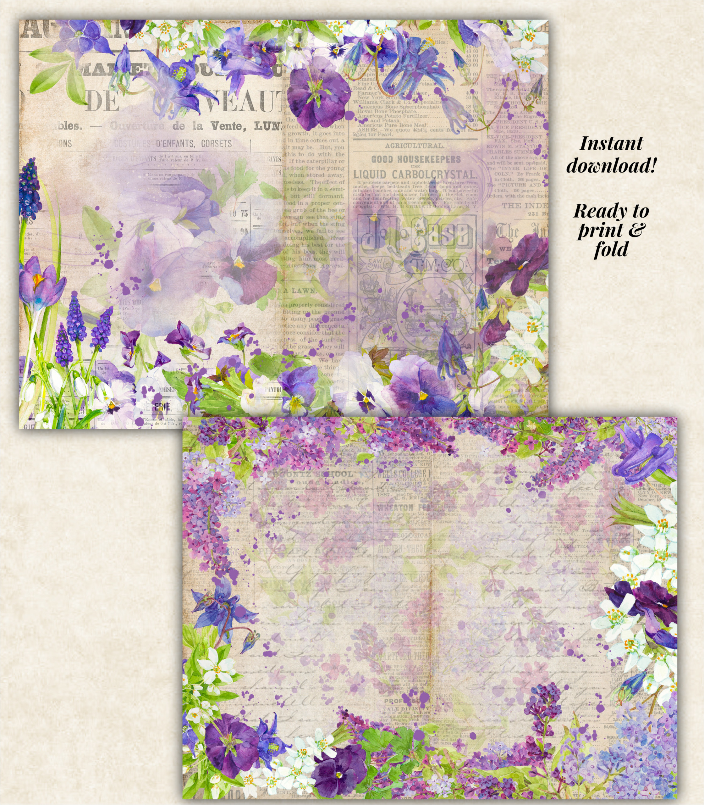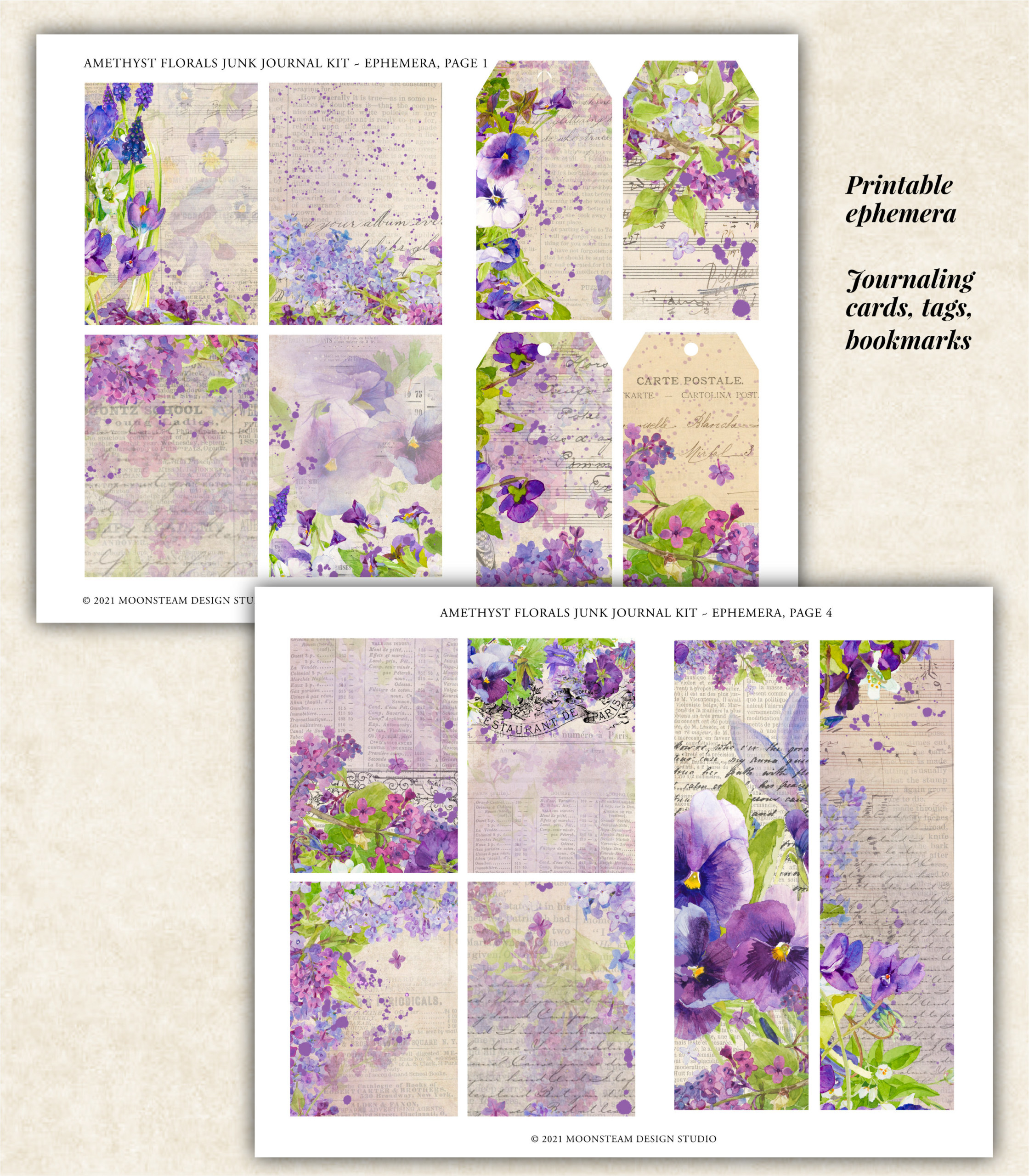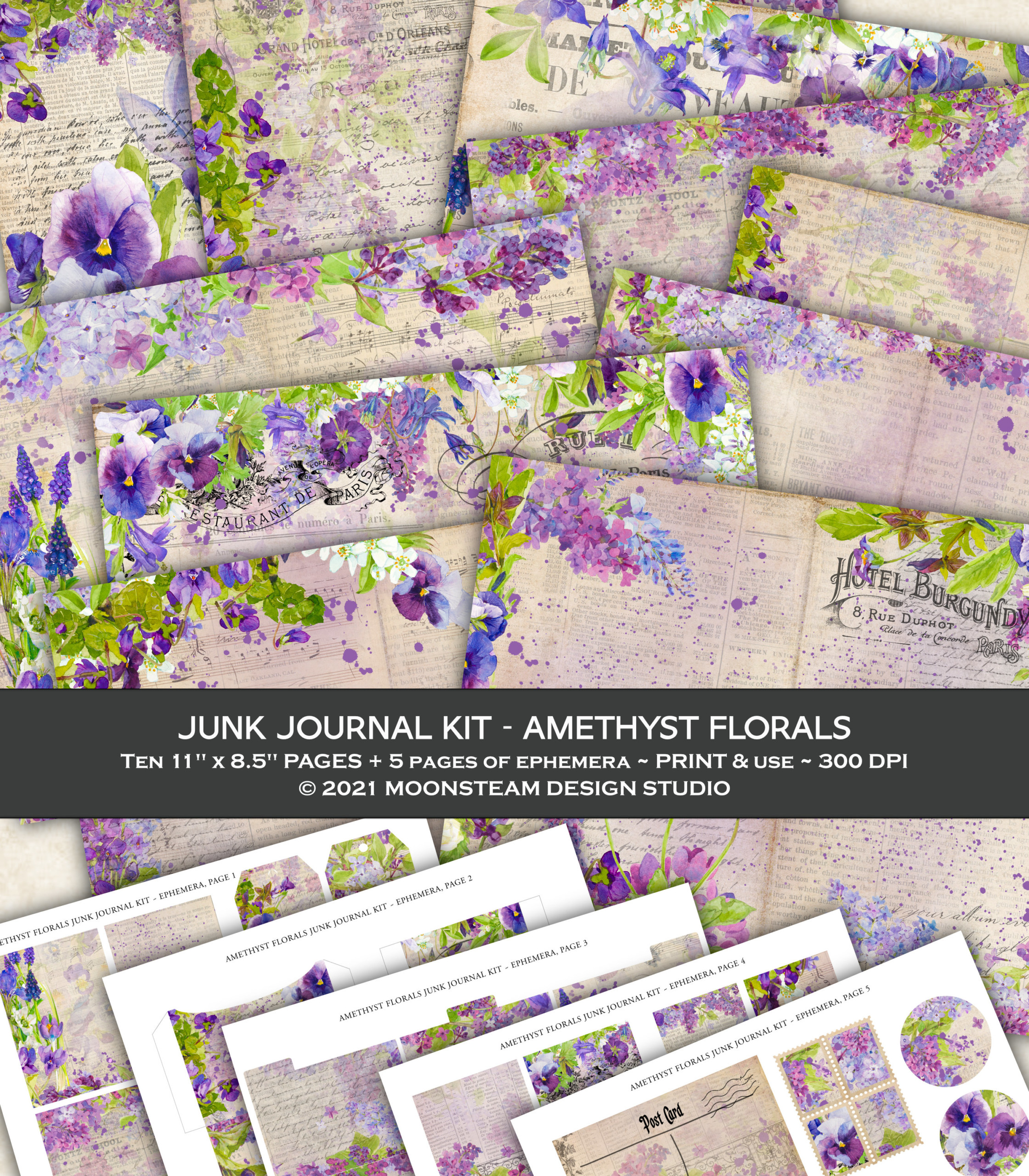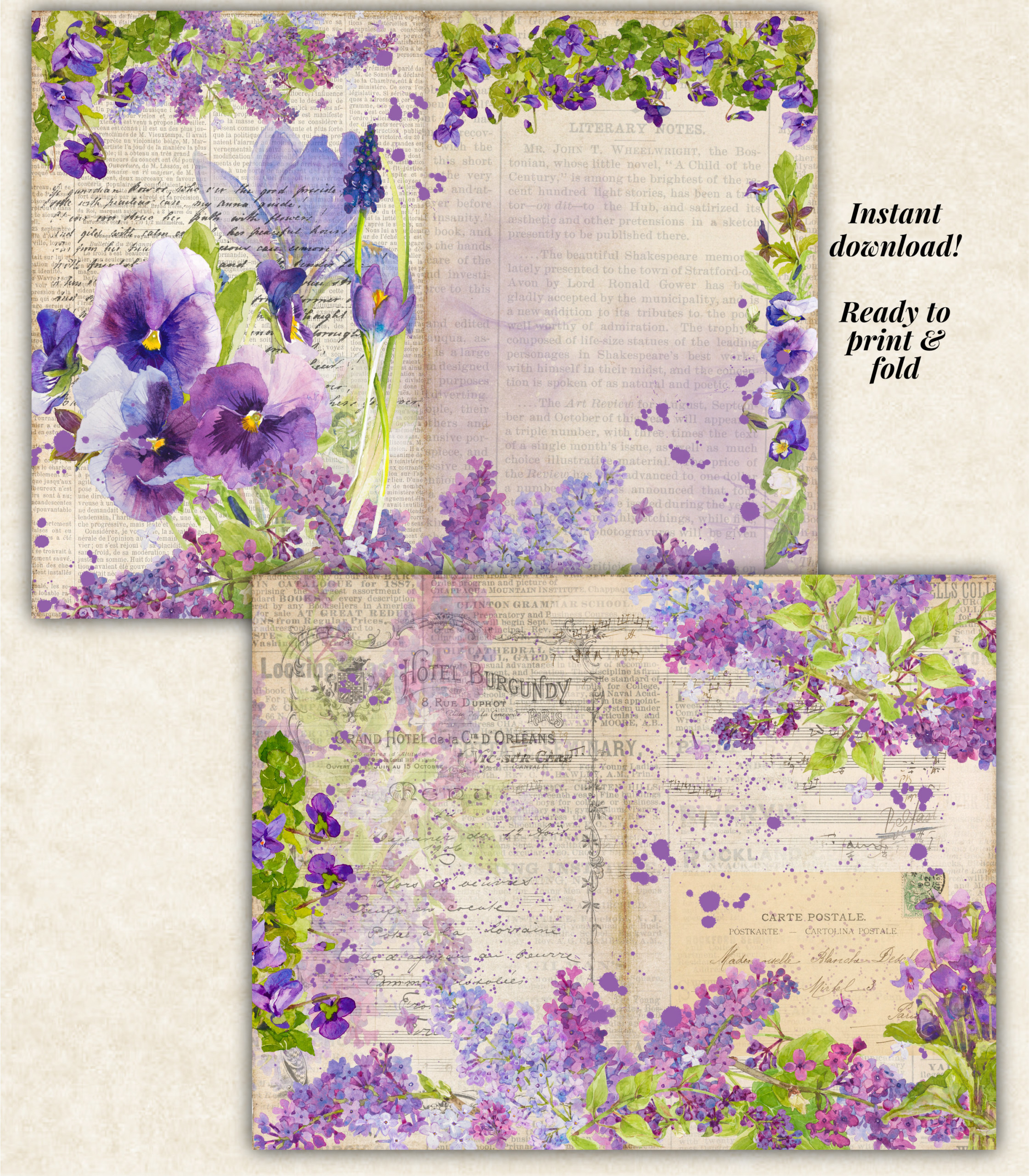 An explosion of purple blooms covers all the pages of this junk journaling kit! Lilacs, wisteria, pansies, violets and more fill each page in a burst of cheery amethyst joy. Perfect for garden-themed journals, spring and summer projects, or anything that could do with lots more purple. 🙂