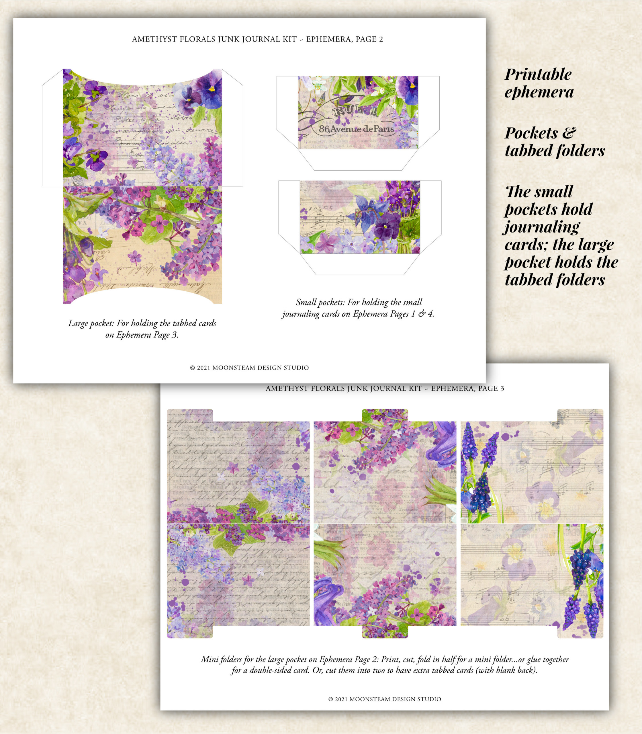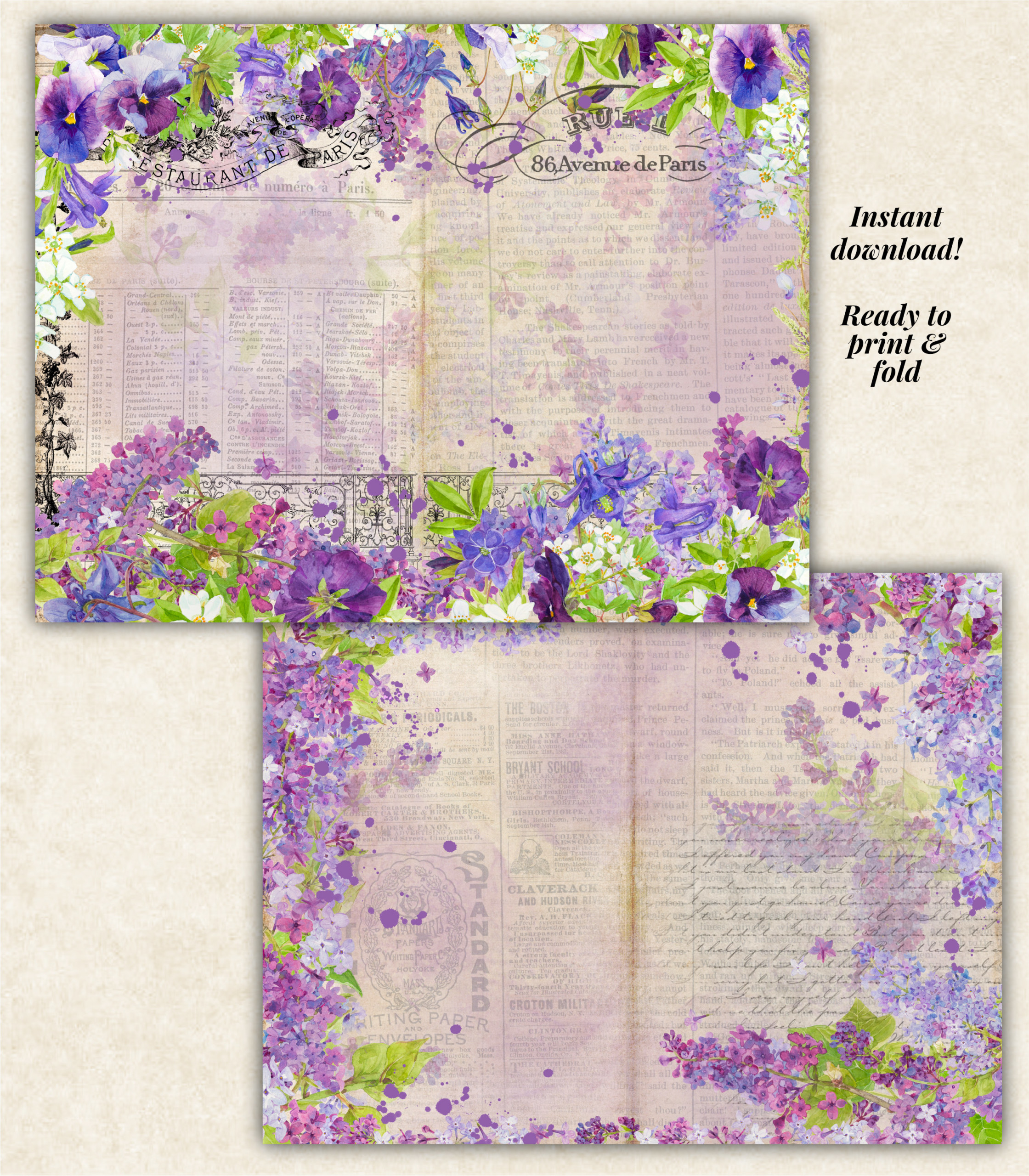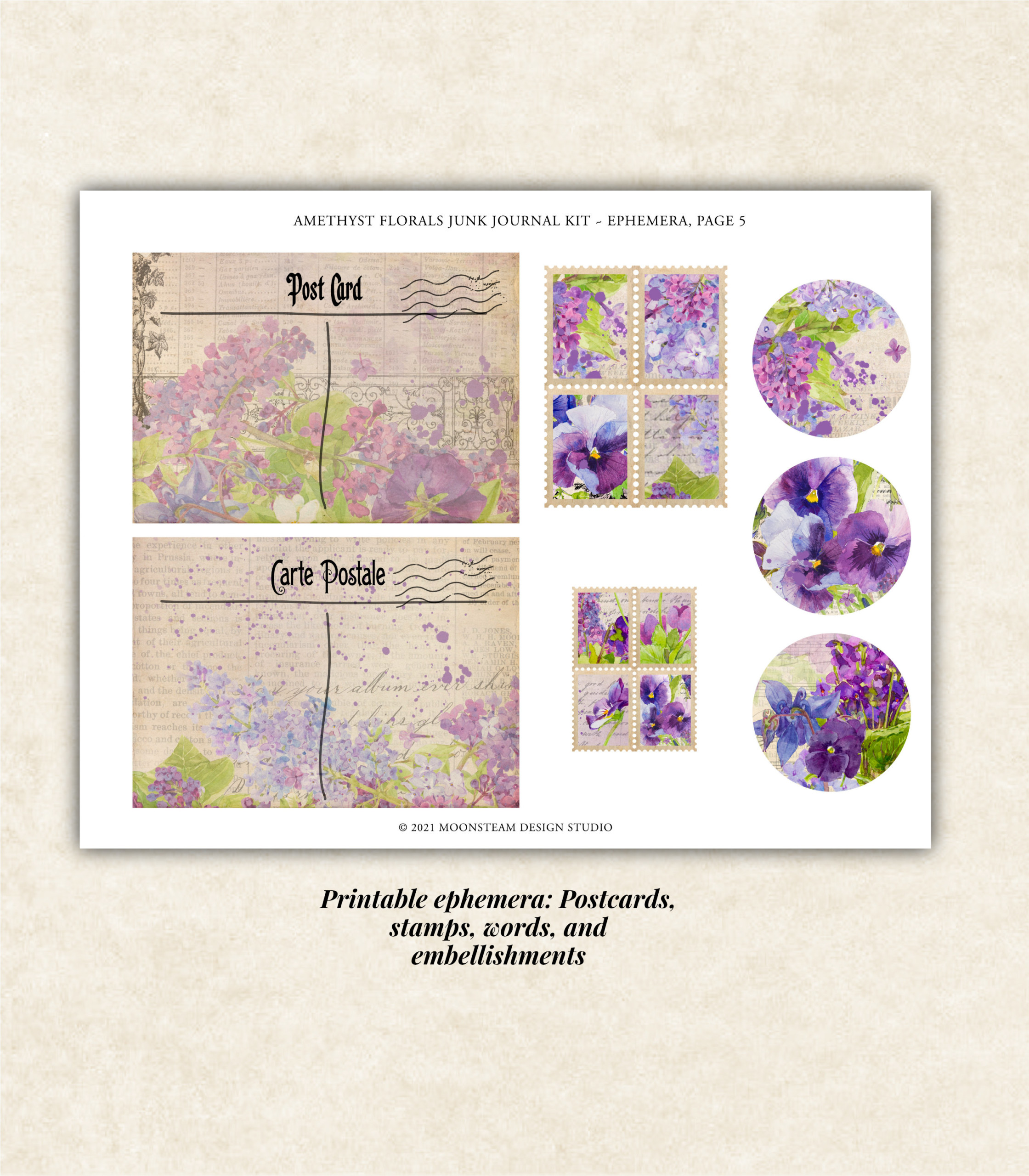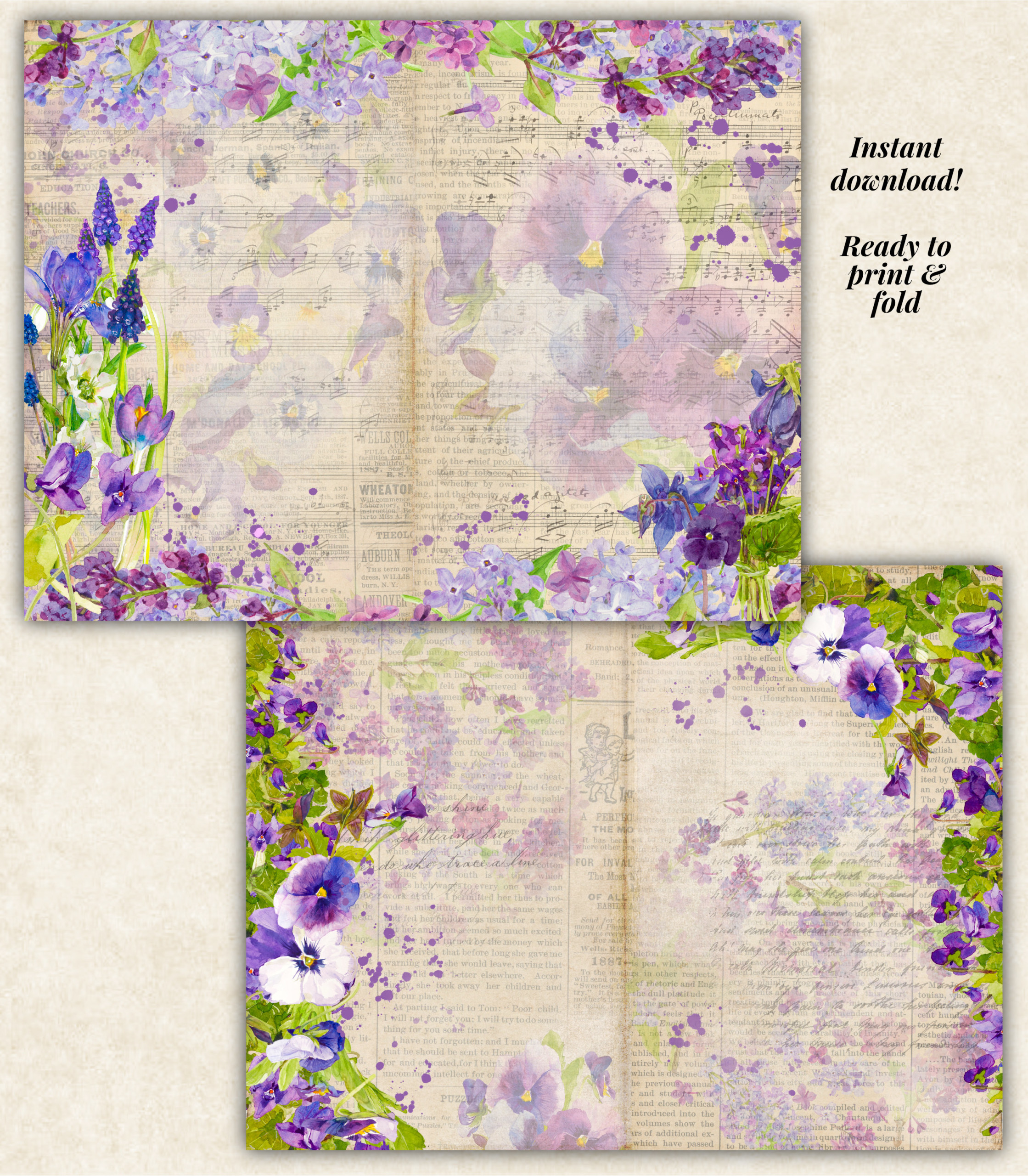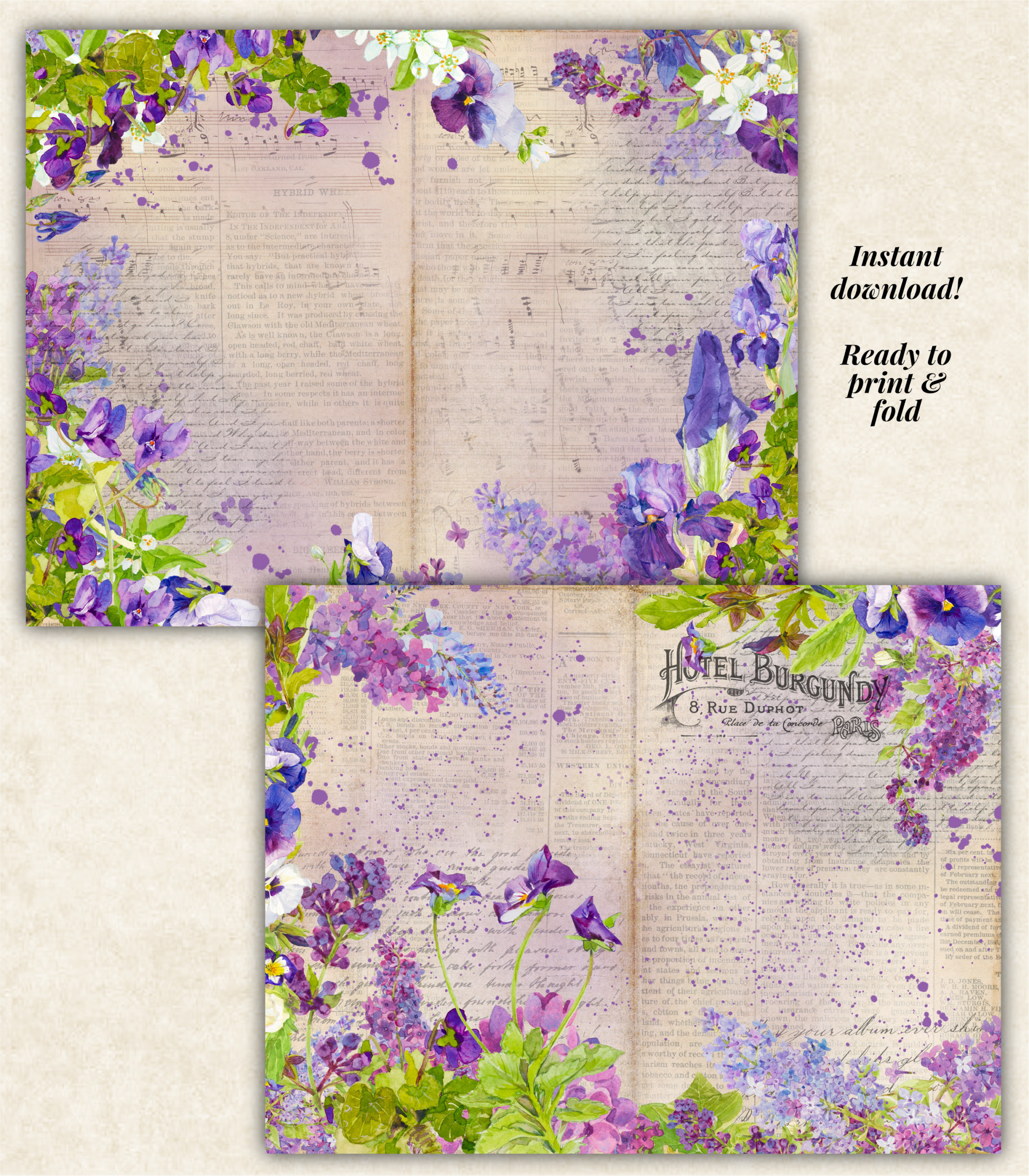 An explosion of purple blooms covers all the pages of this junk journaling kit! Lilacs, wisteria, pansies, violets and more fill each page in a burst of cheery amethyst joy. Perfect for garden-themed journals, spring and summer projects, or anything that could do with lots more purple. 🙂
